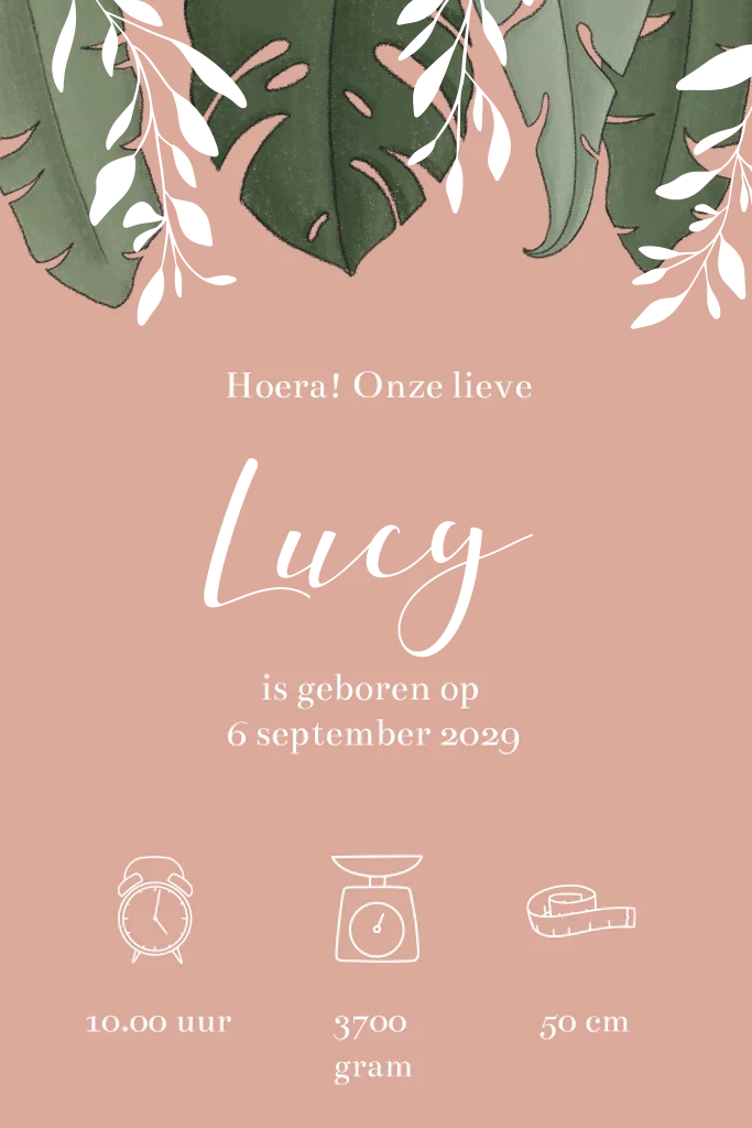 Een mooi geboortekaartje, doordat ze geboortegegevens op de voorkant staan. Leuk voor een meisje. (21815)