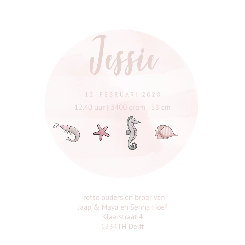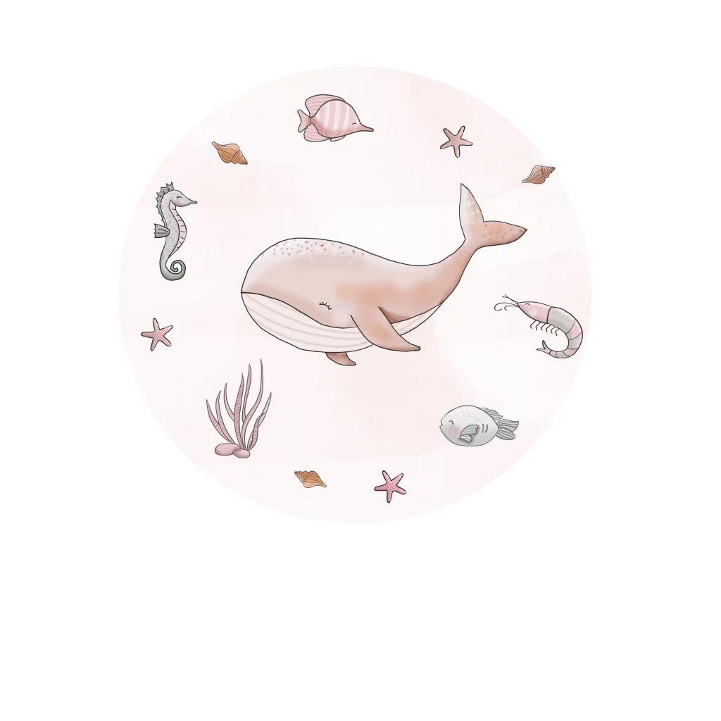 Super leuk meisjes geboortekaartje van een stoere en lieve walvis met eromheen vissen, zeepaardje, garnaal, zeesterren en schelpen. Naam in rose foliedruk. (21293)