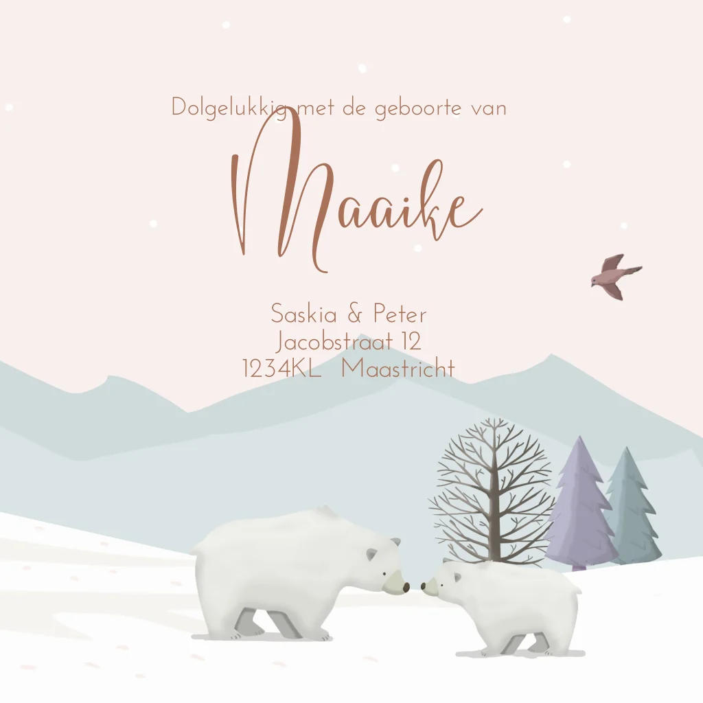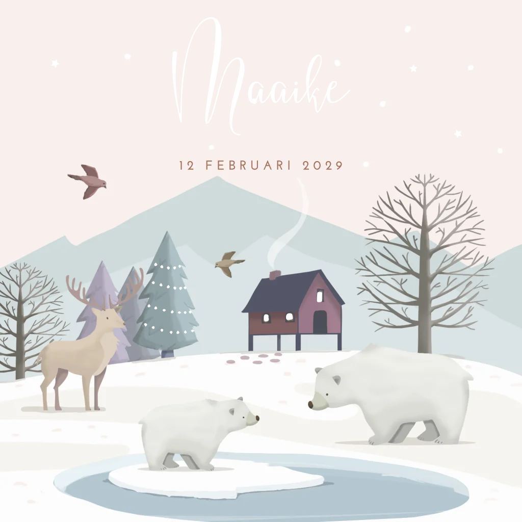 Getekend geboortekaartje ijsbeer winter thema met rose foliedruk vierkant met ijsberen, hert en huisje. (20707)