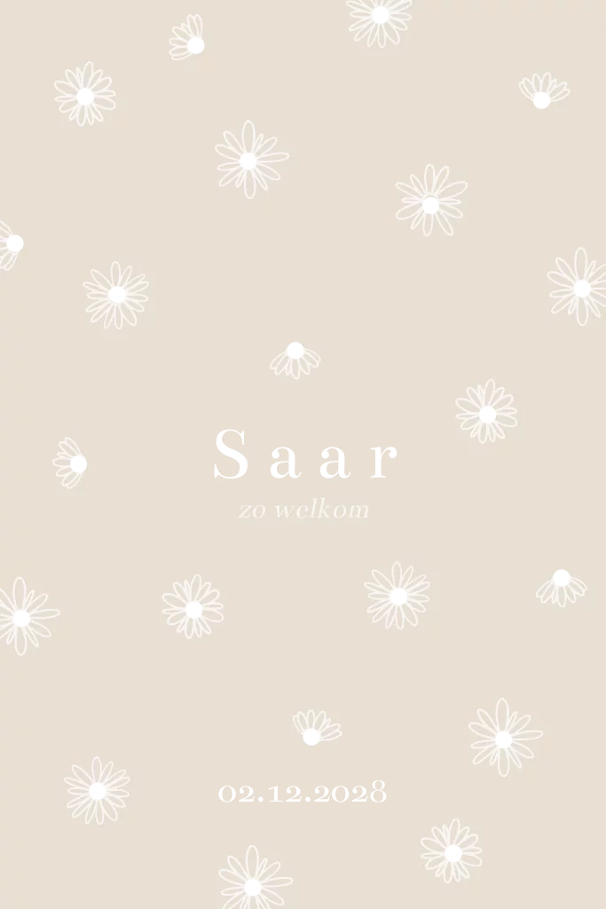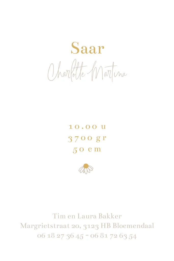 Geboortebloem geboortekaartje met voor de maand april een madeliefje. De hartjes van goudfolie. Echt leuk voor een voorjaar- of zomerbaby. (22330) Geboortekaartje Saar