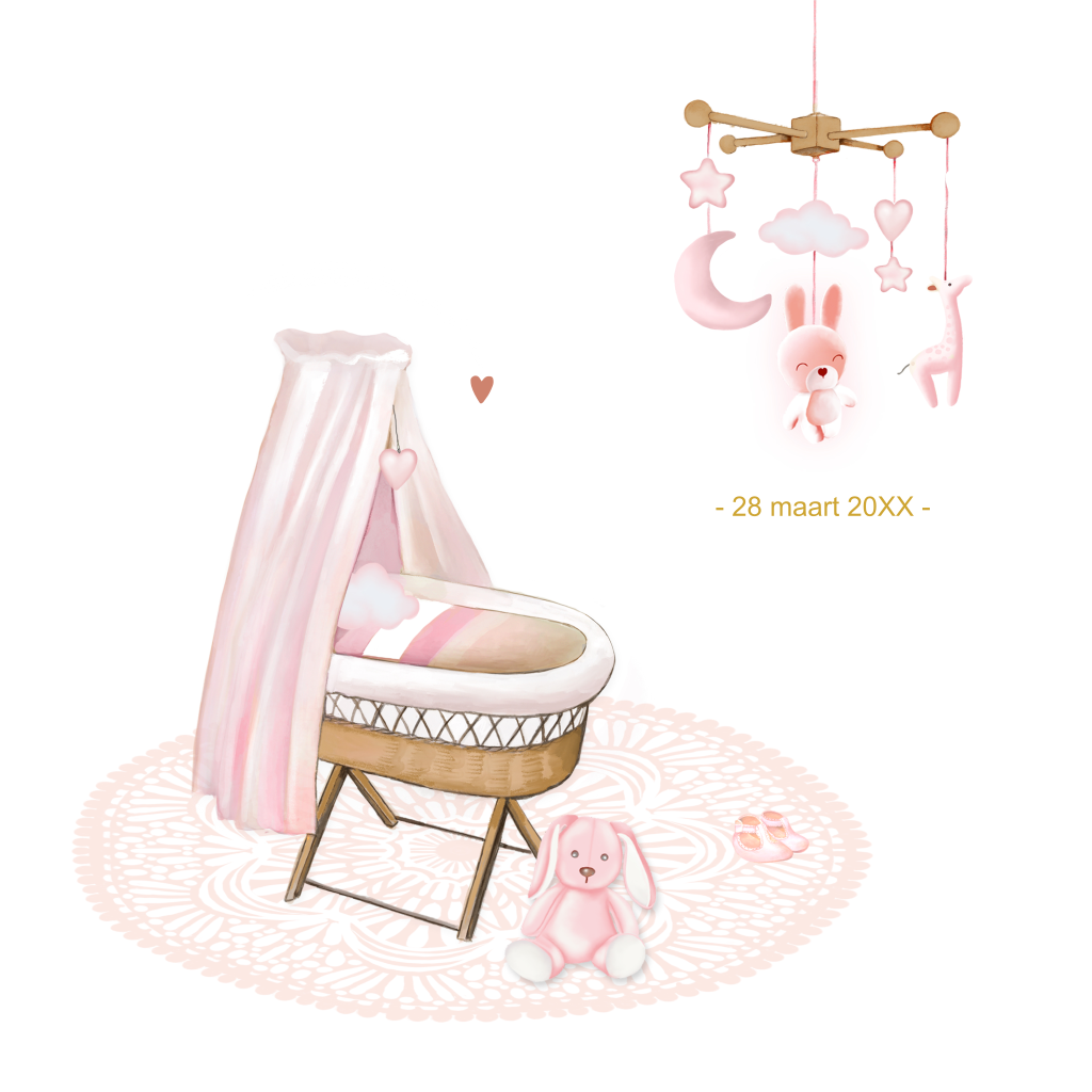 Lief geboortekaartje voor een meisje met wiegje en leuke mobiel. (22493)