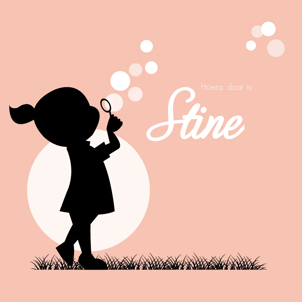 Hip geboortekaartje voor een meisje. Met een silhouette van een meisje dat aan het bellenblazen is. (20506)