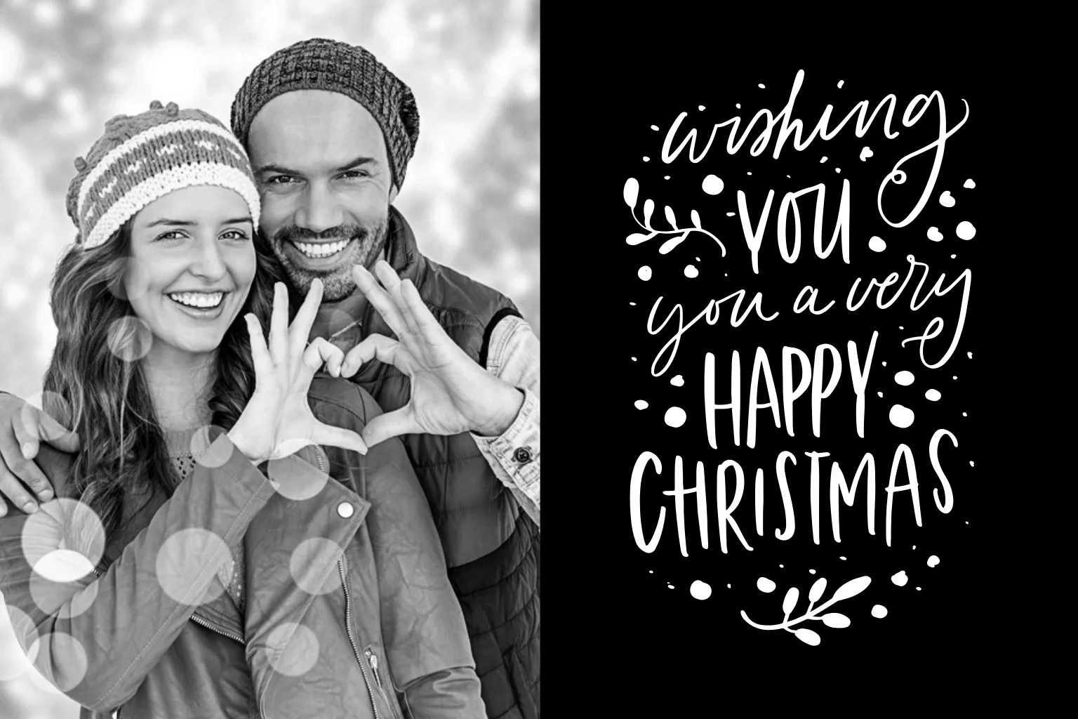 Trendy kerstkaart met foliedruk kerst teksten en ruimte voor 2 eigen foto's. Zowel mooi in kleur als zwart wit. (21444)
