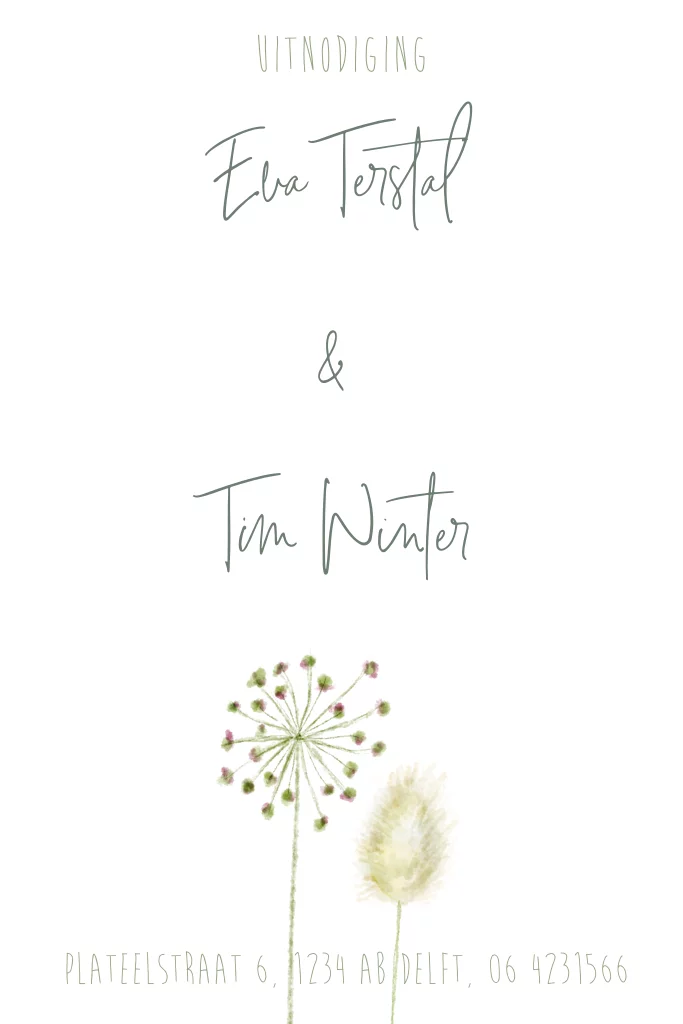 Een mooi getekende jubileumuitnodiging voor een 25 jarig huwelijksfeest, met droogbloemen en goudfolie (21398)