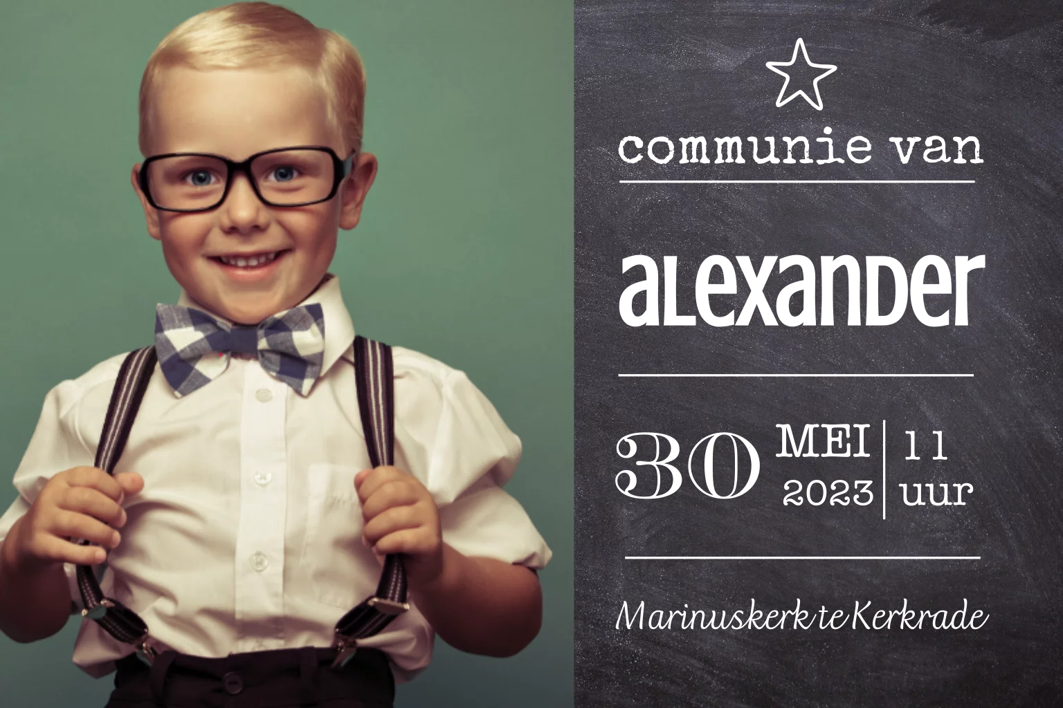 Uitnodiging eerste communie jongen met krijtbord en goudfolie