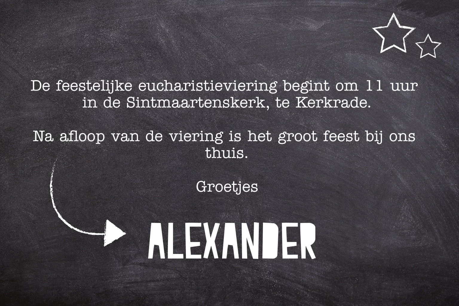 Foto uitnodiging eerste communie met krijtbord en sterren. In echt goudfolie druk (2647)
