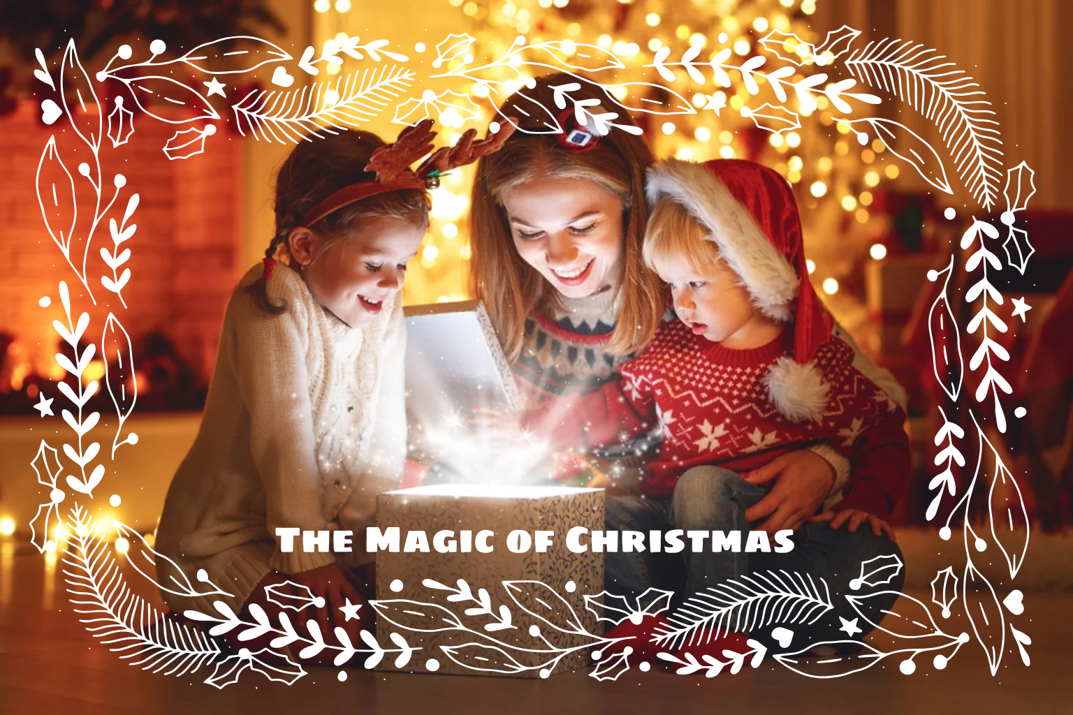 Maak een prachtige kerstkaart met je eigen foto. Vervang de achtergrondfoto die dan meteen onder het goudfolie kader komt te staan. De tekst "The Magic of Christmas" is te veranderen. (21736)
