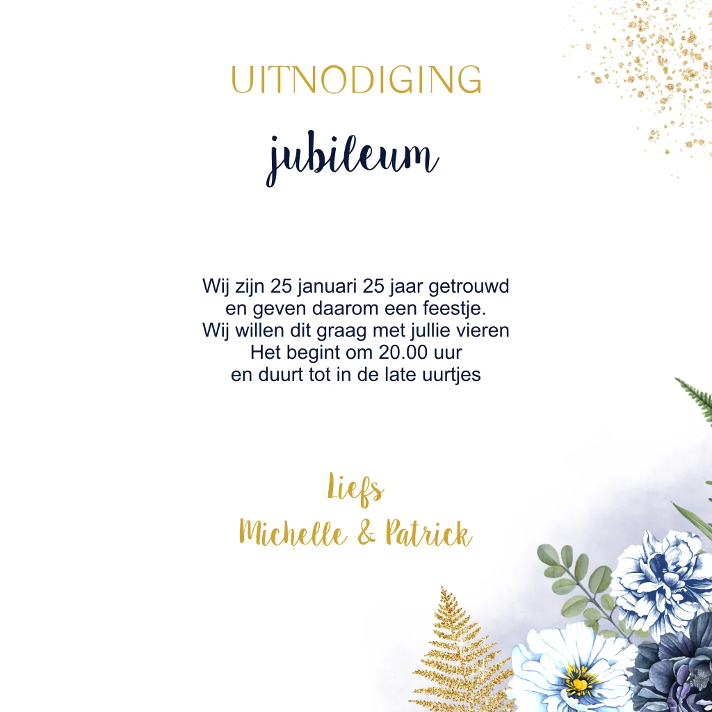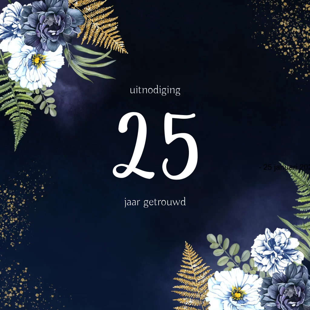Uitnodiging jubileum 25 jaar getrouwd rozen blauw en goudfolie