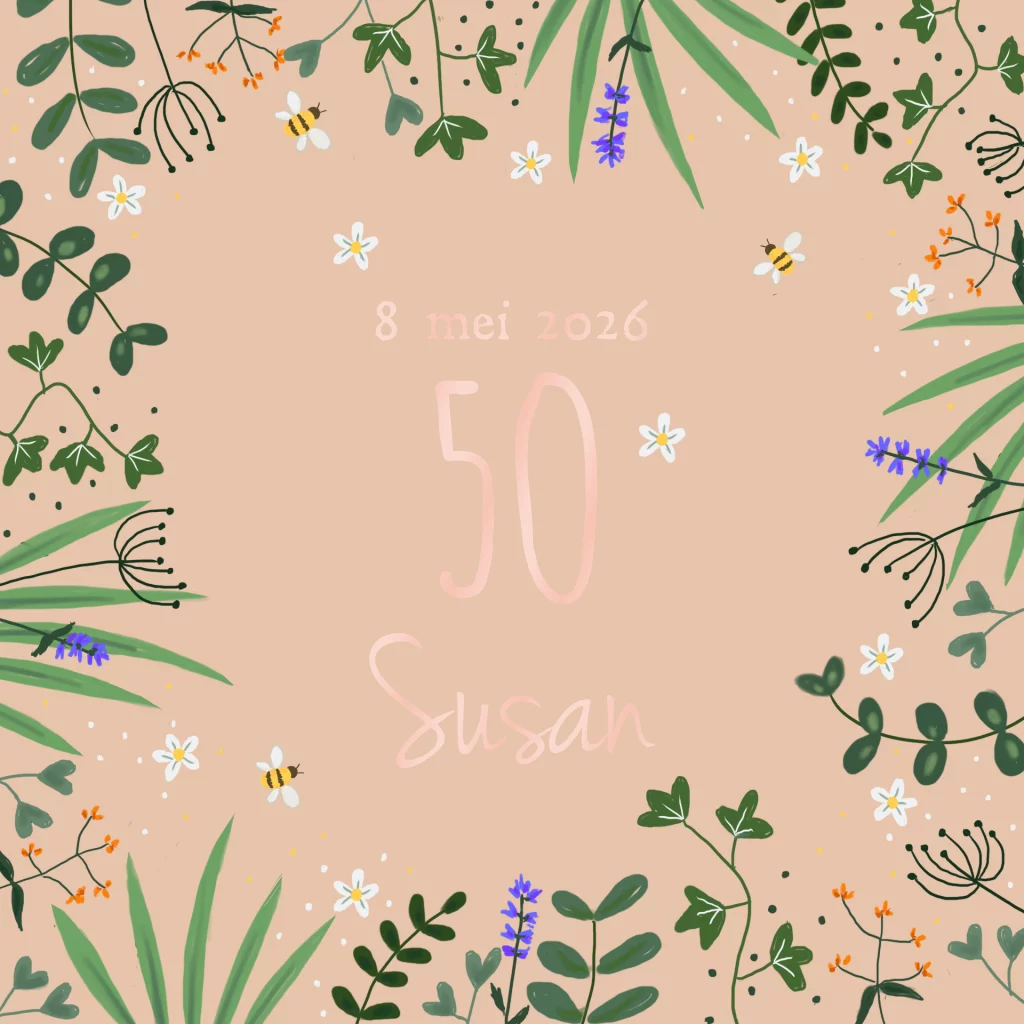Een hippe vijftig jaar uitnodigingskaart met bladeren en bloemen en bijen op een terra achtergrond met prach kleur hoogglans druk op de voorkant. (20853)