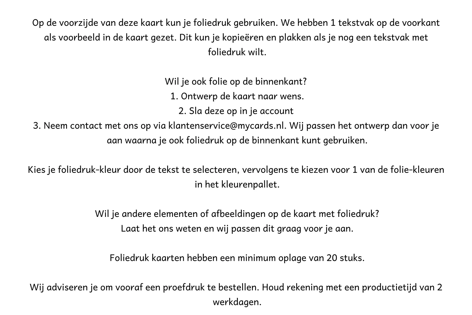 Bij dit kaartje kun je foliedruk aan alle zijdes gebruiken. Je kunt dit kaartje ook bestellen met alleen foliedruk op de voorkant waardoor de kosten per kaart lager zijn. Vragen hierover? Neem gerust contact met ons op.