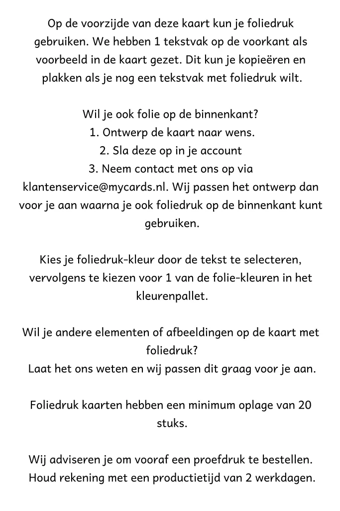 Bij dit kaartje kun je foliedruk aan alle zijdes gebruiken. Je kunt dit kaartje ook bestellen met alleen foliedruk op de voorkant waardoor de kosten per kaart lager zijn. Vragen hierover? Neem gerust contact met ons op.