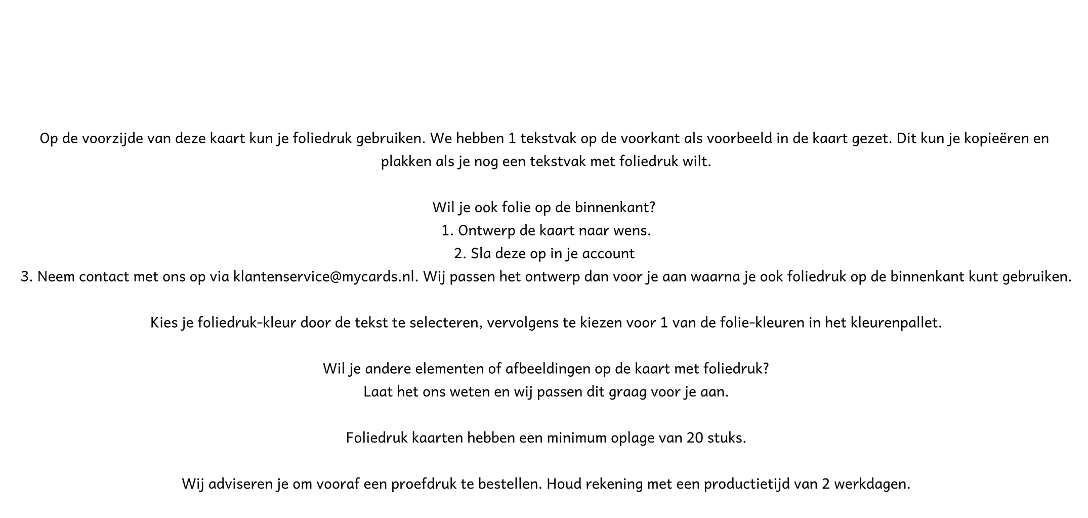 Bij dit kaartje kun je foliedruk aan alle zijdes gebruiken. Je kunt dit kaartje ook bestellen met alleen foliedruk op de voorkant waardoor de kosten per kaart lager zijn. Vragen hierover? Neem gerust contact met ons op.