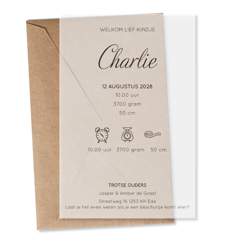 Modern geboortekaartje op wit doorschijnend calco kalk papier kalkpapier met geboorte symbolen klok, weegschaal en meetlint. (23455)