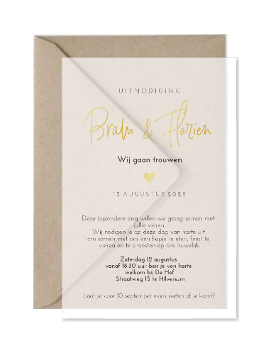 Moderne trouwkaart op wit doorschijnend calco kalk papier kalkpapier met hartje. Je kunt er ook voor kiezen om de namen en het hartje in goudfolie te laten drukken (meerprijs ongeveer 0,80) (23455).
