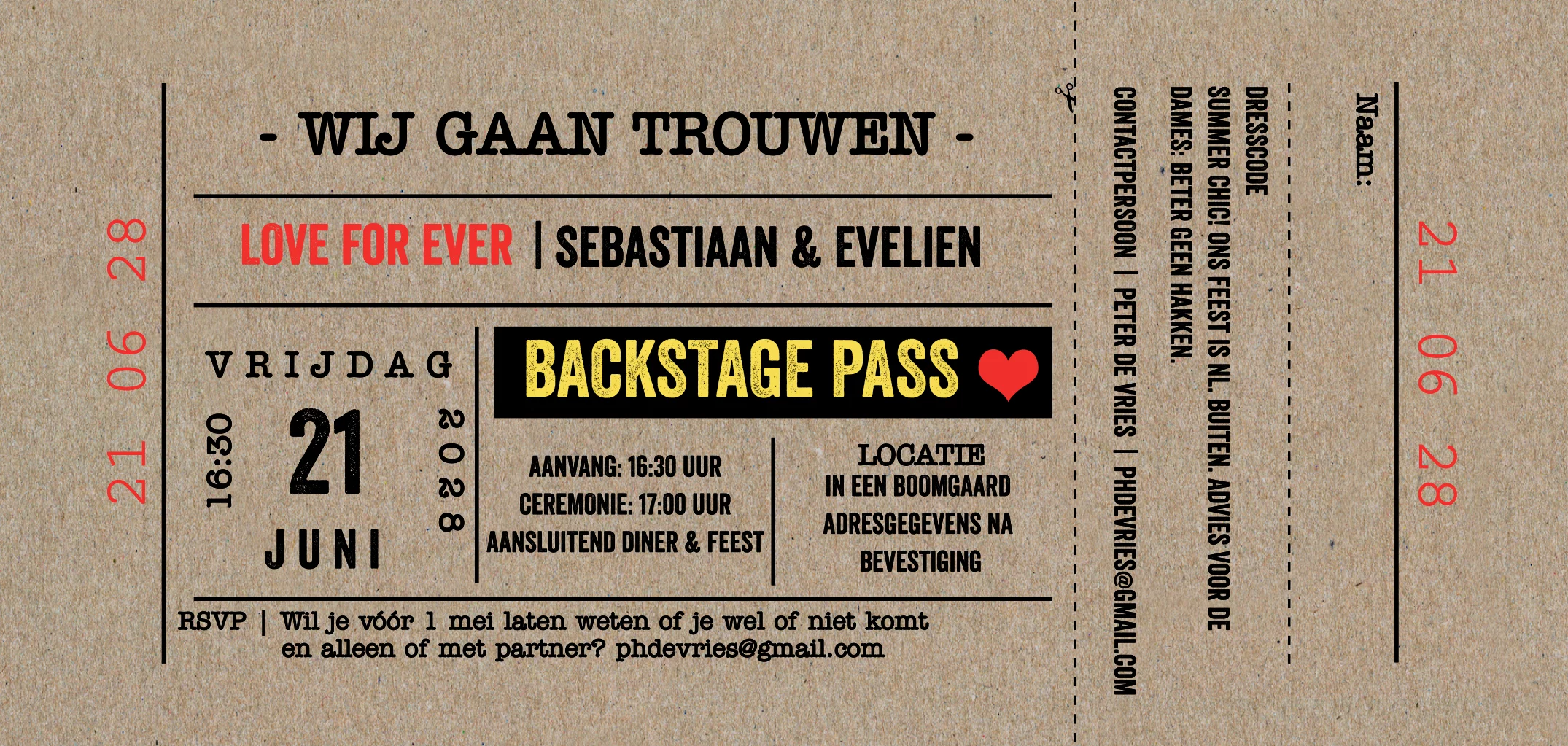 Trouwkaart gedrukt op echt kraft karton in ticket vorm