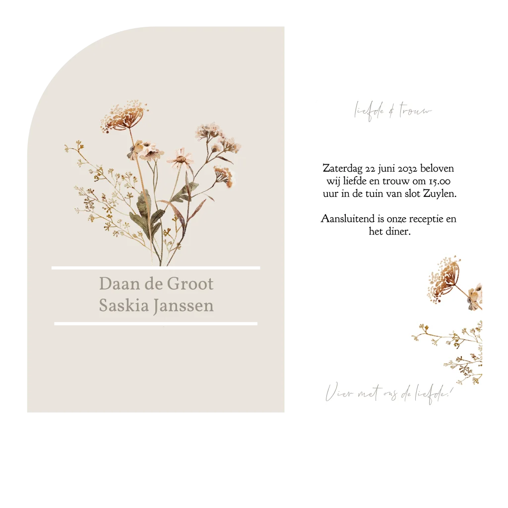 Een prachtige insteek trouwkaart met droogbloemen in warme aardetinten. De trouwkaart bestaat uit 2 kaarten die je d.m.v. een gleuf in elkaar kunt steken, dit zorgt voor een leuke en luxe uitstraling. (24312) Het basis formaat is 21 cm die we snijden, de grootste kaart is ongeveer 10 x 15 cm.