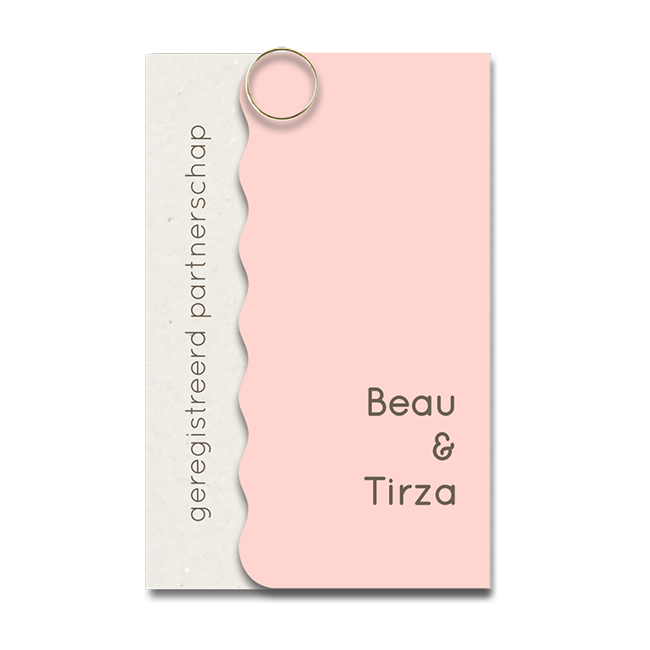 Deze stoere 2-delige uitnodiging voor een geregistreerd partnerschap kun je zelf bewerken. De hoofdkaart heeft hier een eco-look achtergrond en de bovenste kaart een golvende rand en een pastelroze kleur. De twee kaarten kun je aan elkaar te maken met een lintje, touwtje of clipje. Deze kun je bij-bestellen. De grootste hoofdkaart is ongeveer 11 x 17 cm.