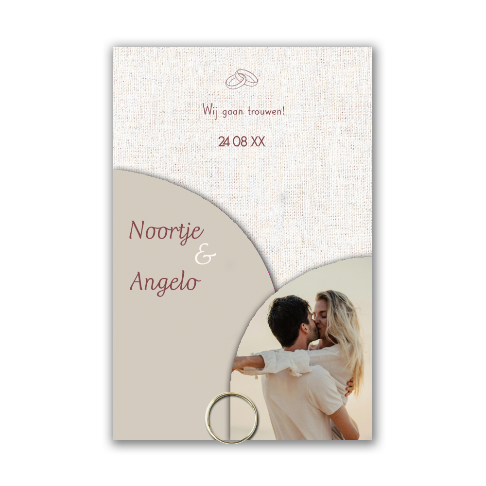 Prachtige 3 delige trouwkaart met linnen-look en foto