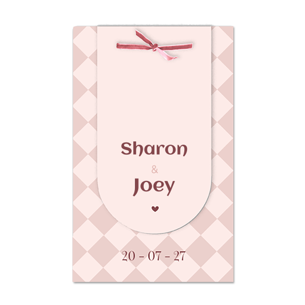 Deze hippe trouwkaart bestaat uit 2 delen en kun je zelf eenvoudig bewerken door de kleuren en teksten aan te passen. Op de hoofdkaart een ruit patroon waarop je de kleinere kaart aan kunt bevestigen met een mooi lint of koordje, dit via de gaatjes in de kaarten. Dit kun je in het proces bijbestellen en die je zelf te monteren. De kaart is uiteindelijk ongeveer 10,5 x 16,5 cm. (30354)