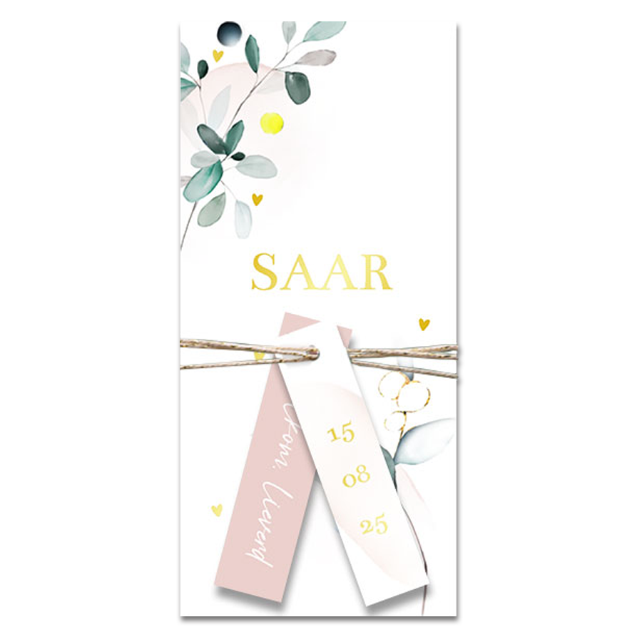 Label geboortekaartje met vrolijke watercolor bloemen is ontzettend lief. Perfect voor jullie kleine kindje. De labels die je met touw vast kunt maken zorgen voor een luxe uitstraling. De naam in het strakke lettertype springt er echt uit. De hartjes geven de zachte kaart een lief element. (24122)