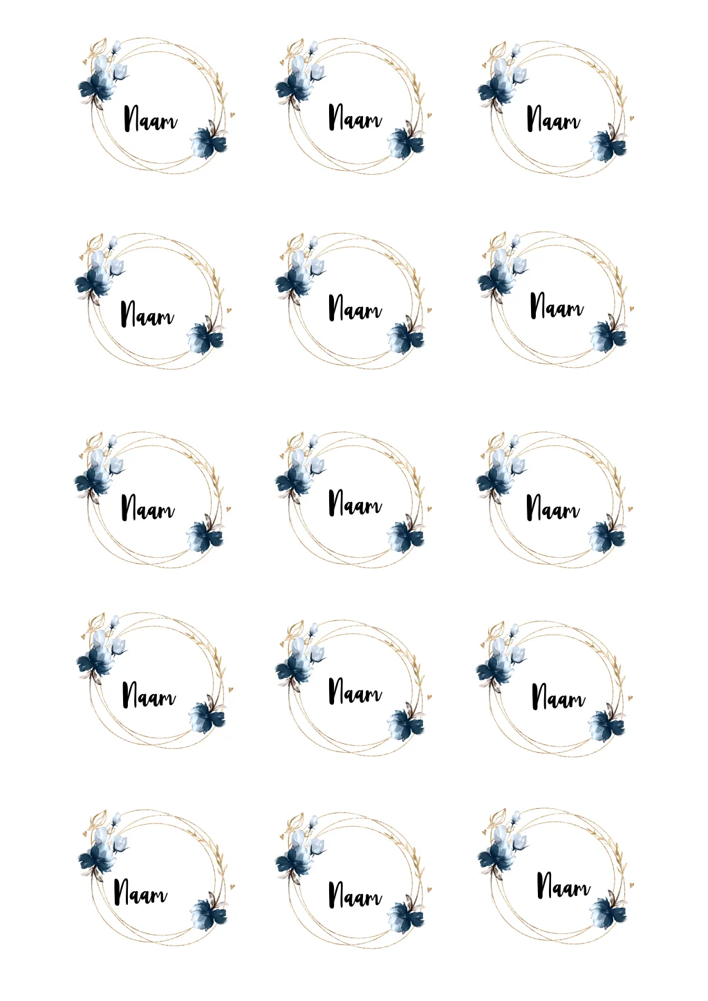 Het design is een mooie krans van goudfolie en ring met bloemen in het blauw. (22511)