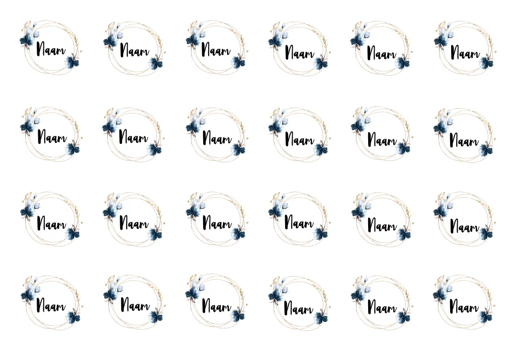 Naamkaartjes vierkant 24 stuks met krans en blauwe bloemen.