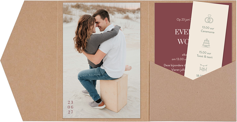 De pocketfolds kun je tijdens de bestelprocedure mee bestellen en zijn er in meerdere kleuren. Dit is het perfecte product om jullie trouwkaart in te verpakken. Op deze manier kun je meerdere kaartjes als een pakketje bij elkaar houden. Let op: een pocketfold is geen envelop.