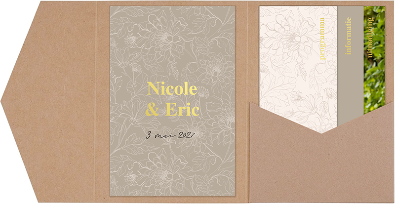 Trouwkaart Pocketfold bloemen goudfolie en foto