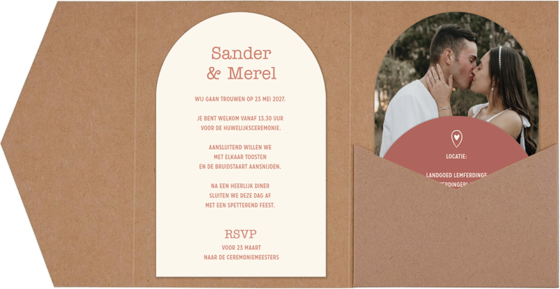 Trouwkaart pocketfold set eigen foto boogvorm