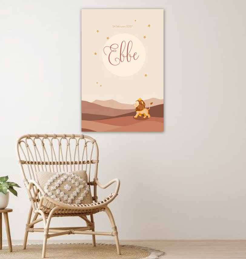 Poster Geboorte in bruin tinten voor een jongen of meisje met een leeuwtje en sterretjes. (24569)