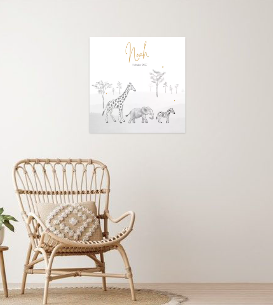 Een hippe poster voor een kinderkamer met jungle / safari thema met dieren, giraf, olifant en zebra. (22579)