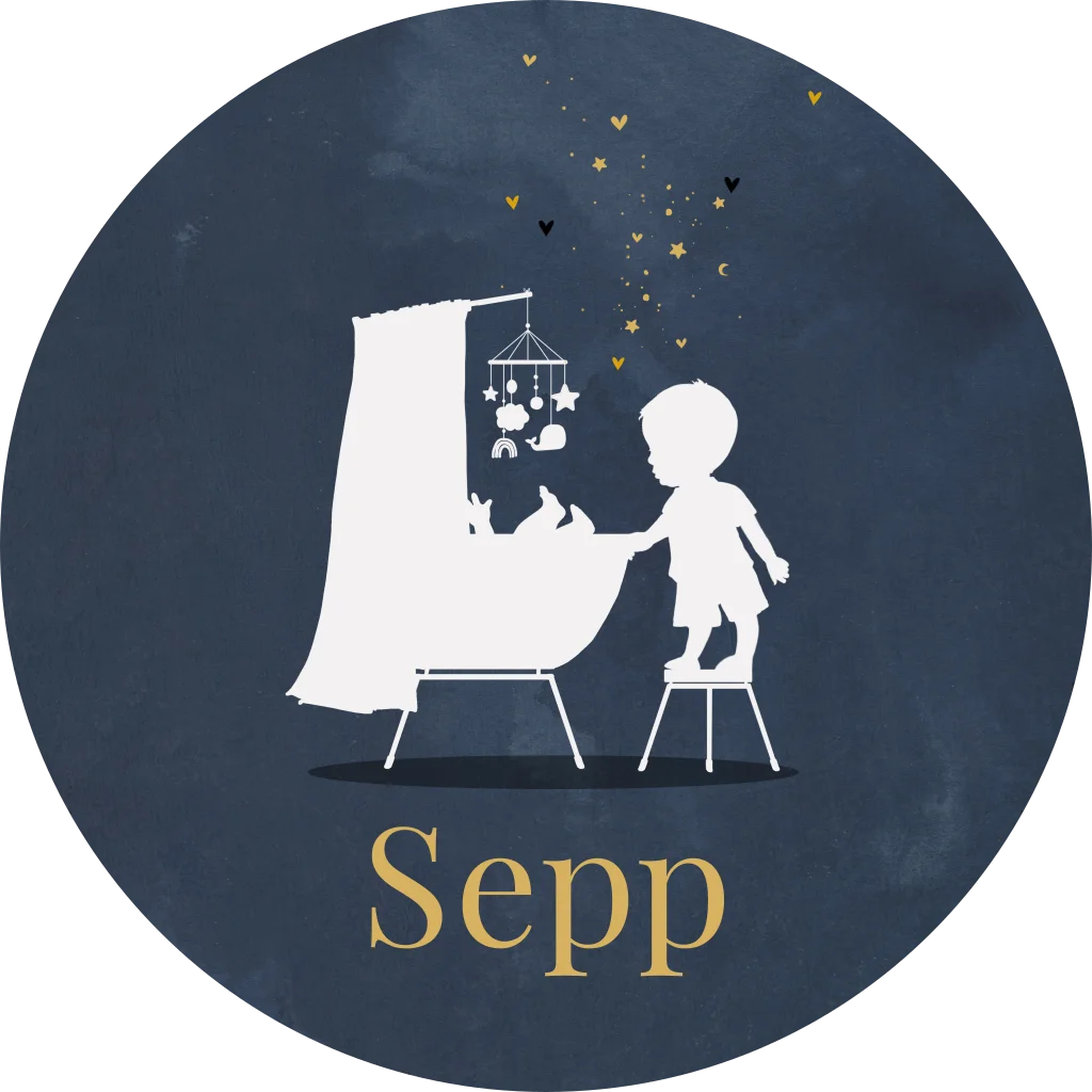 Sluitzegel geboortekaartje 2e kindje om de geboorte van een jongen aan te kondigen. Met een wieg waarin de jongen ligt met muziekmobiel en de grote broer die in de wieg kijkt. (22895)