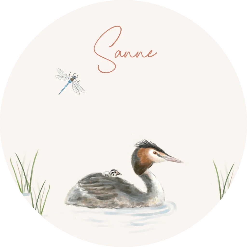 Sluitzegel met fuut met baby op haar rug. Erboven vliegt een libelle. (24033)