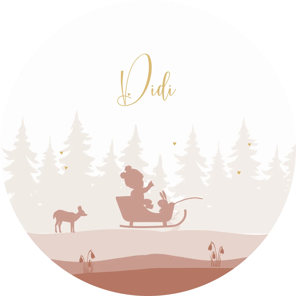 Sluitsticker baby meisje in winters tafereel met sneeuw en slee (22823)