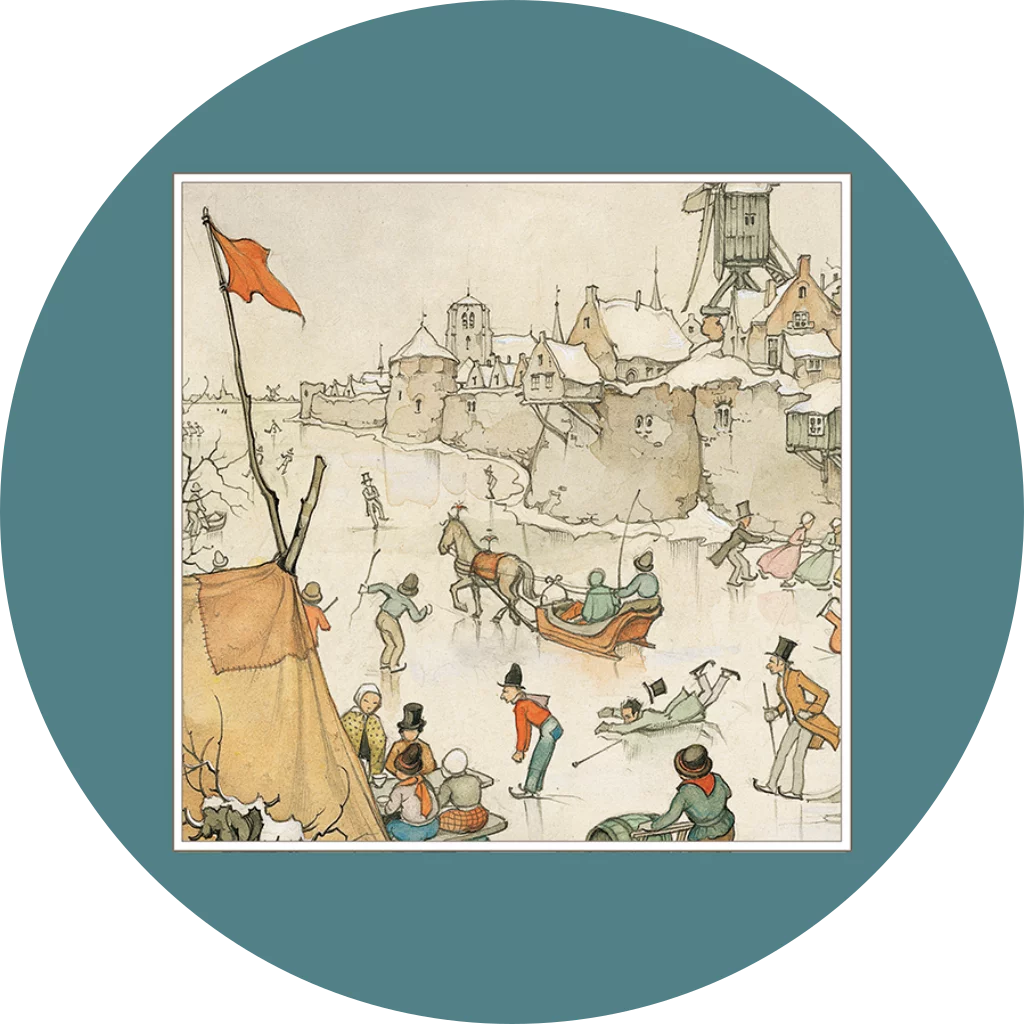 Sluitzegel met een afbeelding van Anton Pieck met schaatsende mensen