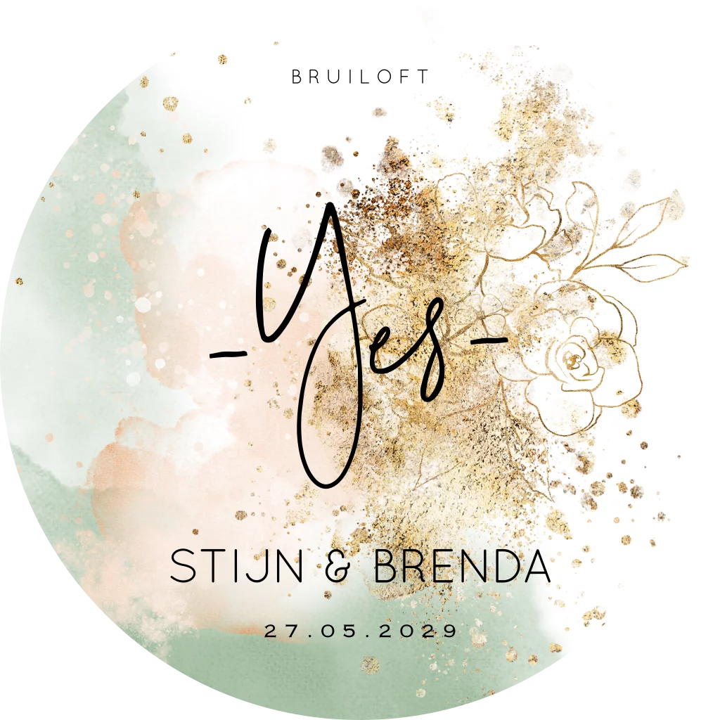 Sticker met groen en roze aquarel en goud kleurige spetters