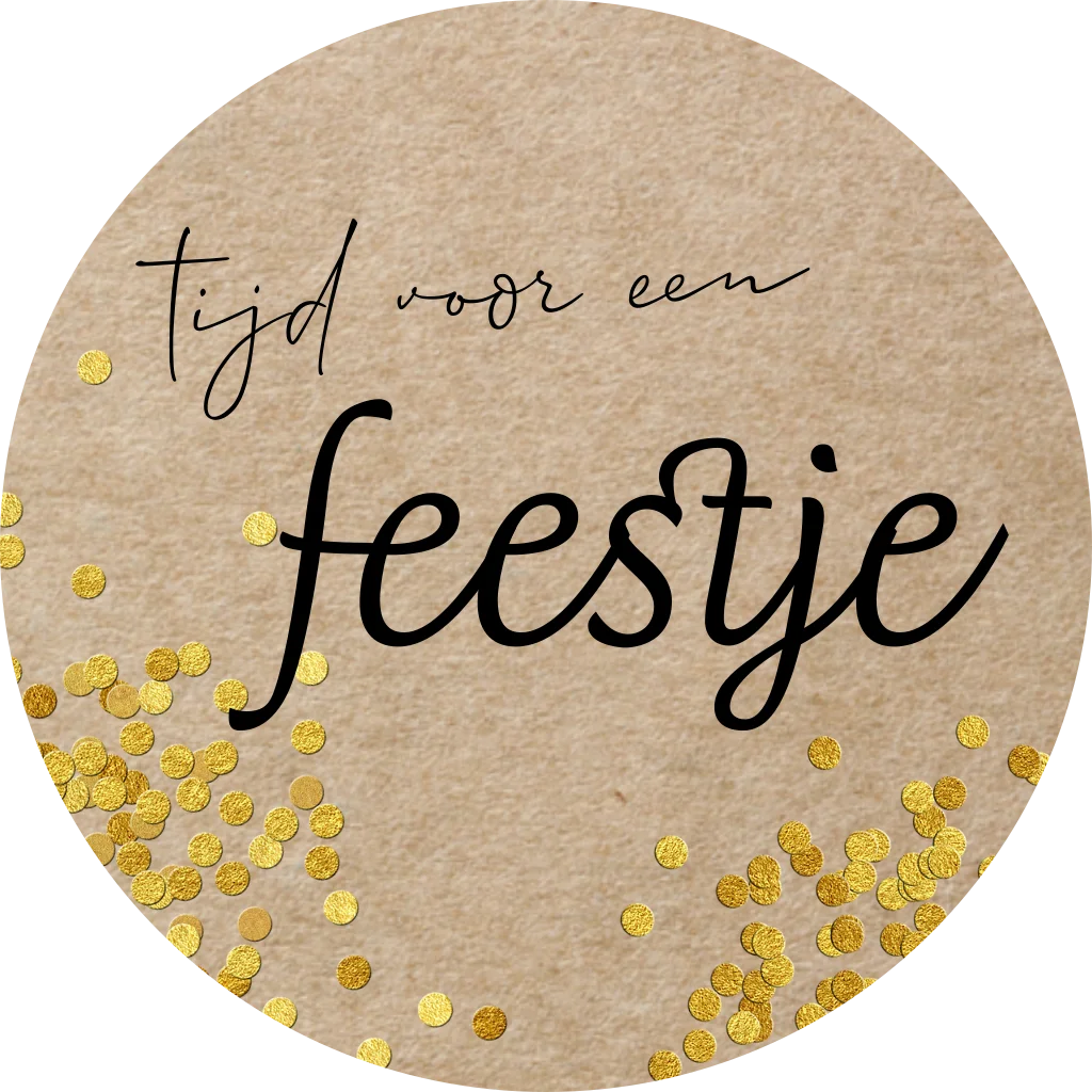 Tijd voor een feestje sticker met kraft look karton als achtergrond en goud-look confetti snippers. (23920)