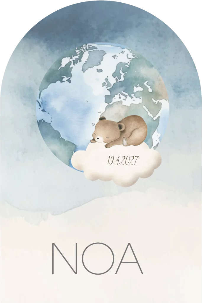 Wereldbol geboortekaartje voor een jongetje in een bijzondere boogvorm met een beertje op een wolkje bij de aarde. (24641)