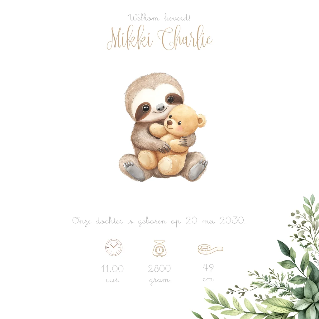 Geboortekaartje unisex luiaard met teddybeer met rond gat