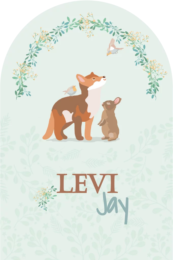 Geboortekaartje voor een jongetje in een boogvorm met een konijntje, vosje en vogeltje. (24528)