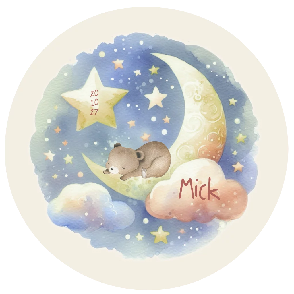 Geboortekaartje voor een jongen in ronde vorm met beer, maan en sterren. (24706)