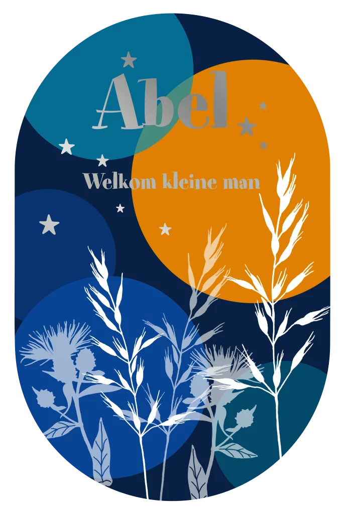 Geboortekaartje voor een jongen in een ovale vorm met blauwe en oranje cirkels. Bloemen en sterretjes. (999999)