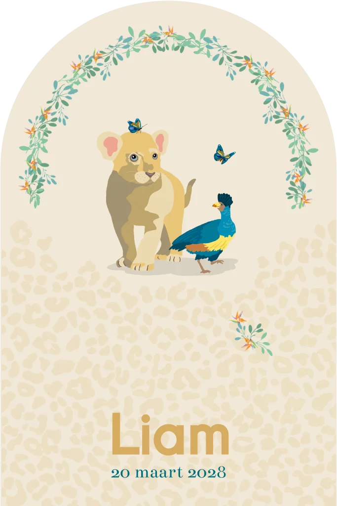 Geboortekaartje voor een jongen in een bijzondere vorm met leeuw en vogel. (24525)