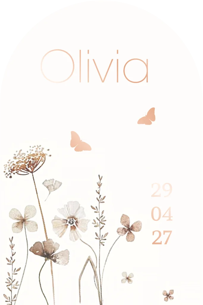 Geboortekaartje voor een meisje in bijzondere boogvorm met veld bloemen en vlindertjes. (24636)