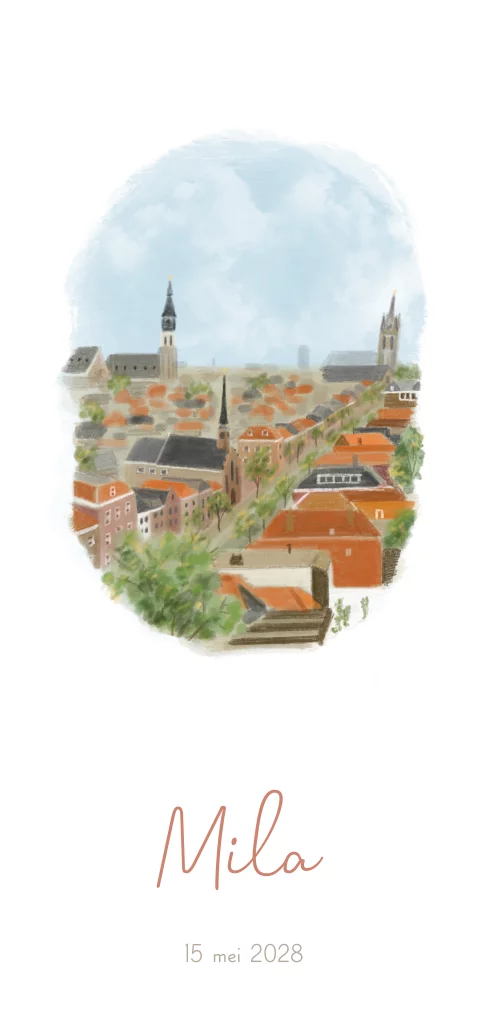 Een geboorteaartje voor een meisje met de mooie stad Delft met de hand getekend (24001)