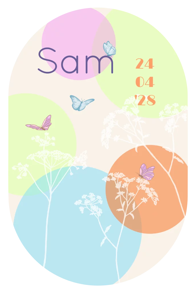 Geboortekaartje voor een meisje in een ovale vorm met gekleurde cirkels, bloemen en vlindertjes. (999999)