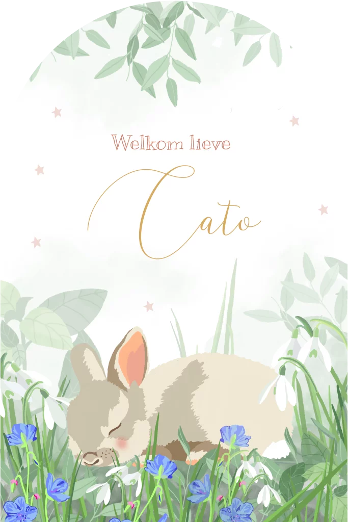 Lief geboortekaartje voor een meisje gedrukt in een bijzondere boogvorm met een slapend konijntje. (24702)