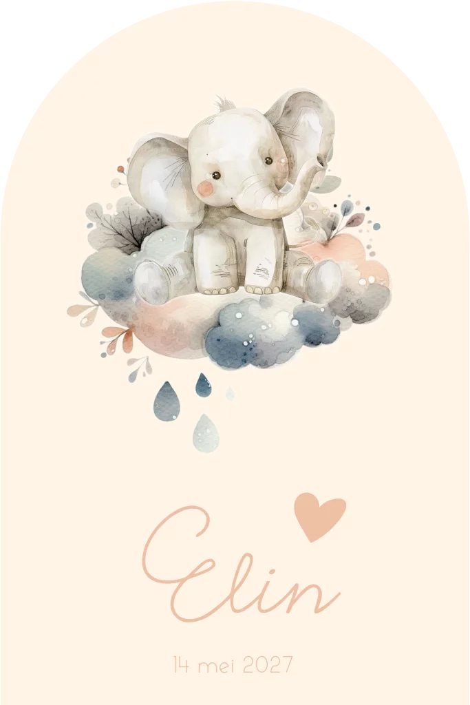 Geboortekaartje meisje in boogvorm met een olifantje op een wolk