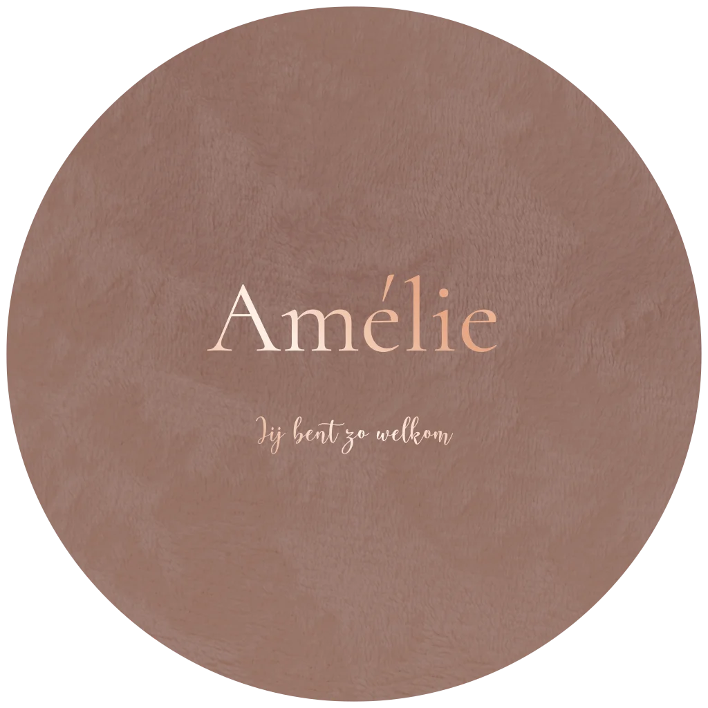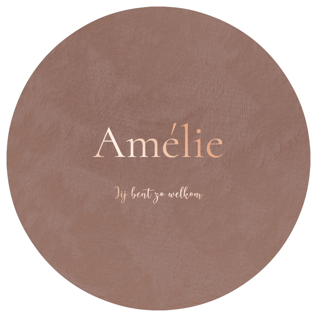 Meisjes geboortekaartje in ronde vorm met een achtergrond van pluchelook in warme kleur en rosefolie tekst. (23100)