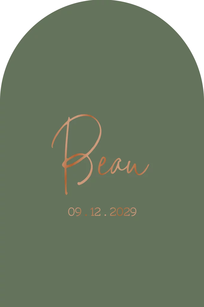 Stoer geboortekaartje met ronde bovenkant en naam in hoogglans koper lak. (23169) Geboortekaartje Beau